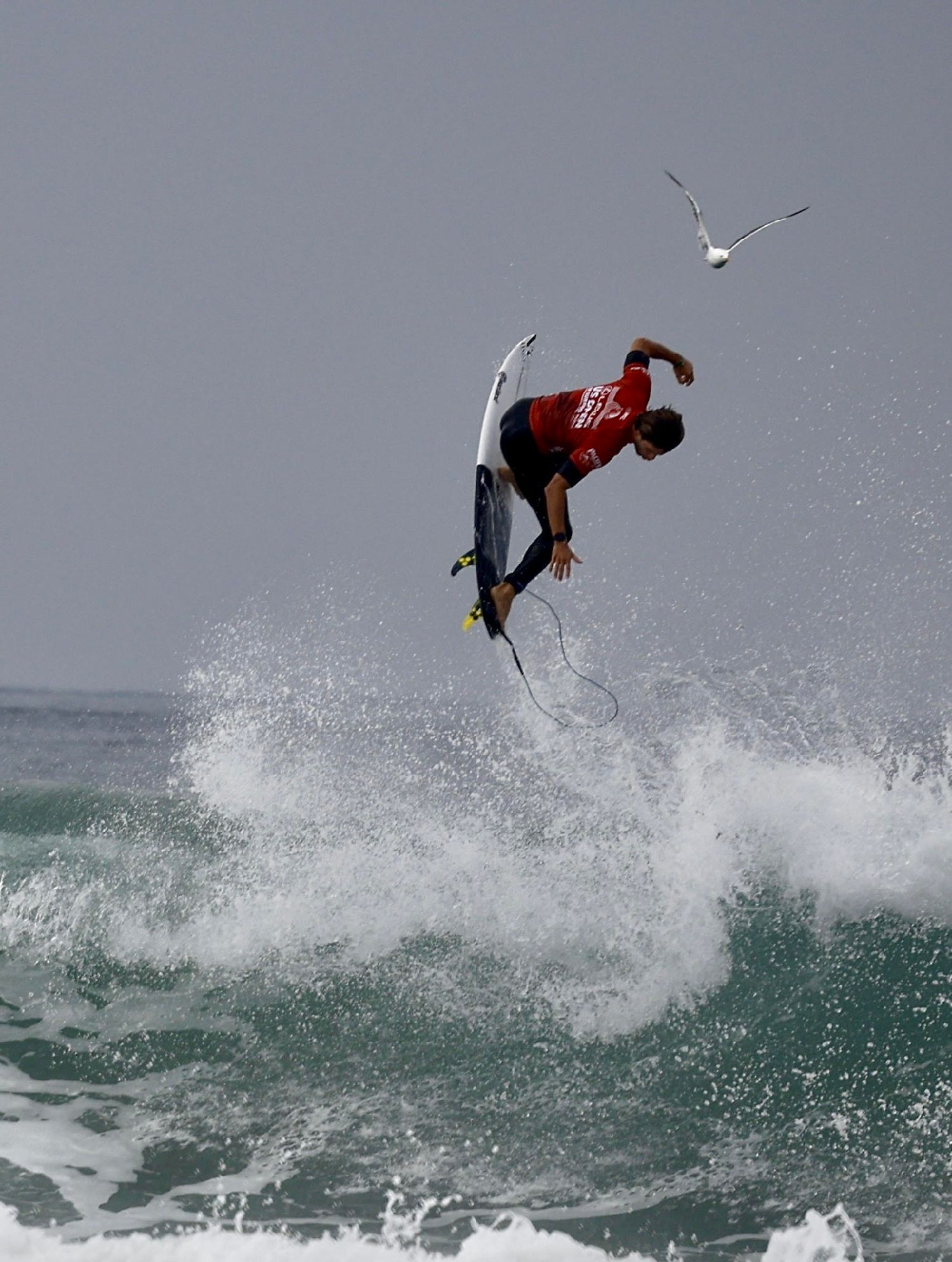 由于比赛当天风大浪高,一名选手被大浪抛上了天。侨报图片