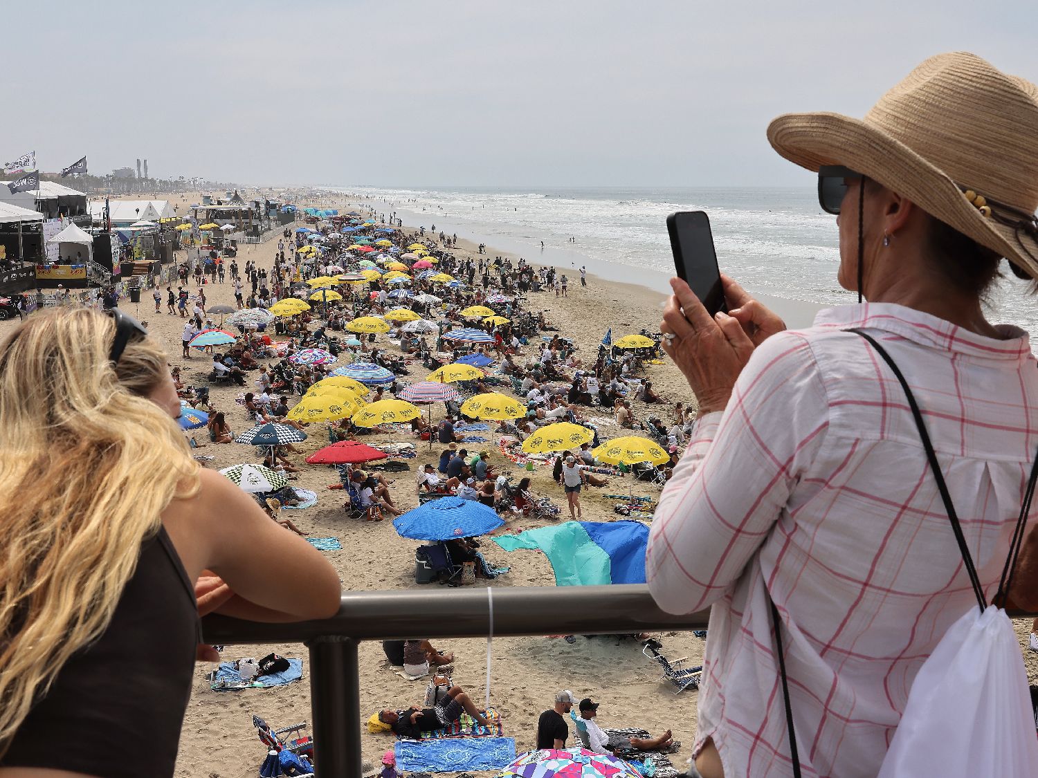 一名女子在栈桥上俯拍美国冲浪公开赛挤满人群的沙滩。侨报图片