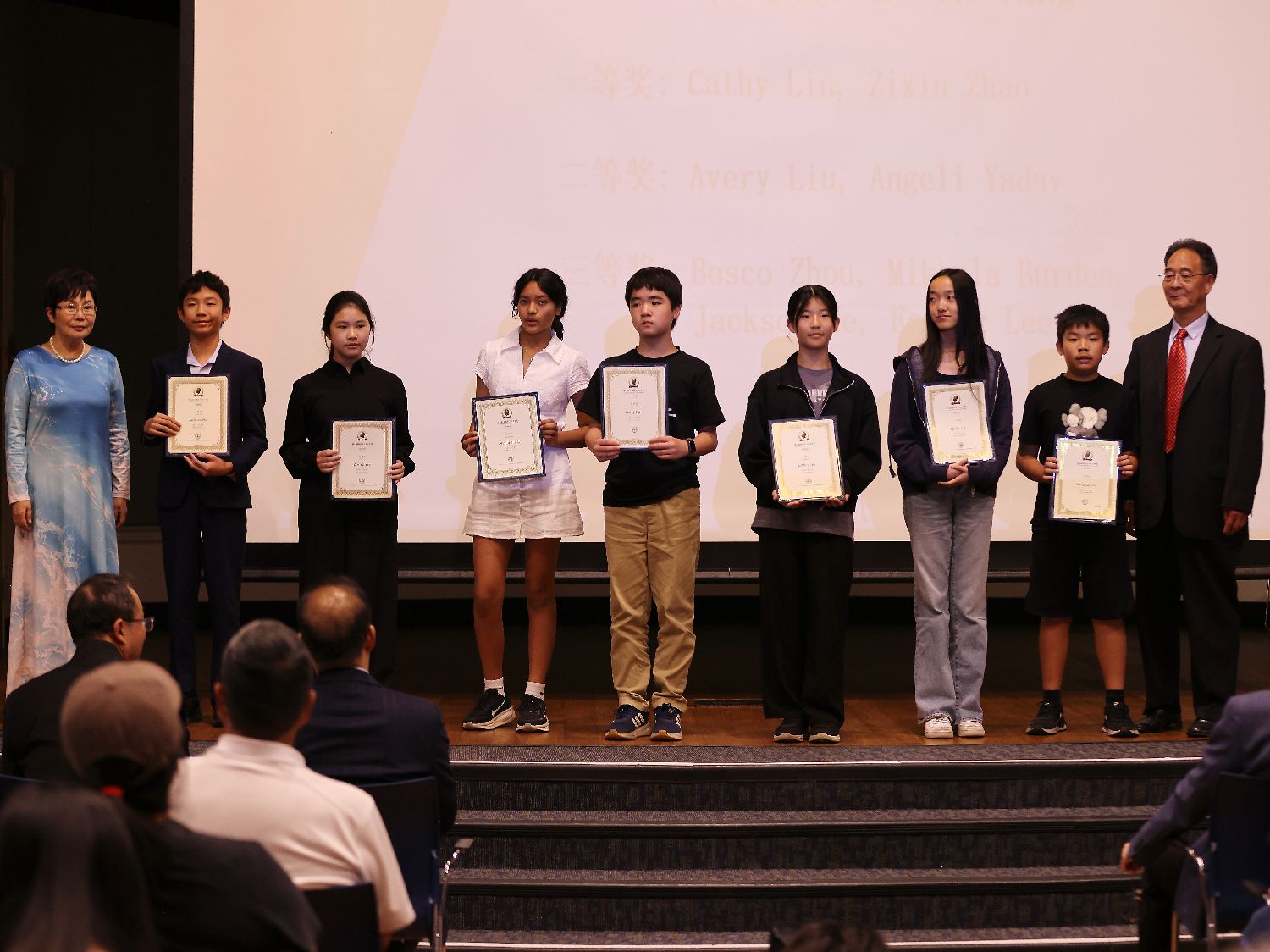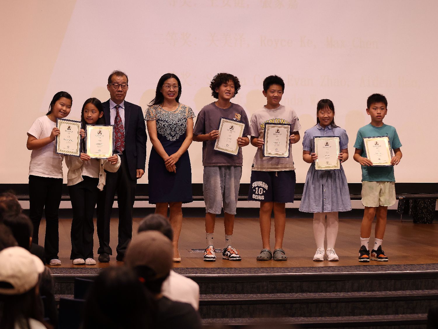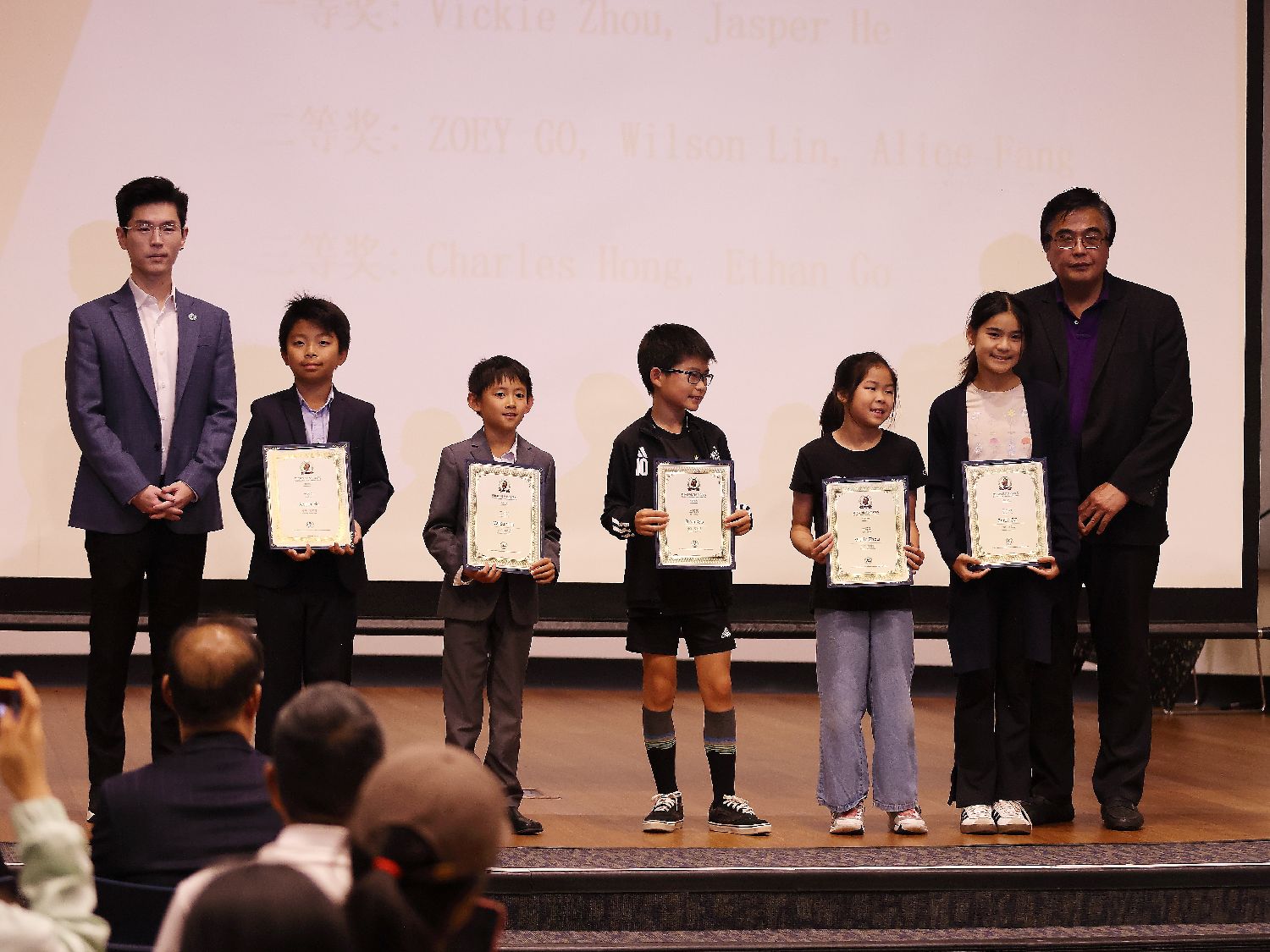 小学中文组获奖者:特等奖:Nayomi Zheng;一等奖:王安健、张家嘉;二等奖:关美泽、Royce Ke、Max Chen;三等奖:Serena Cai、Evan Zhao、Aiden Hao、吴泳锋、Miranda Wu。颁奖嘉宾:王太钰参赞、刘国云会长。