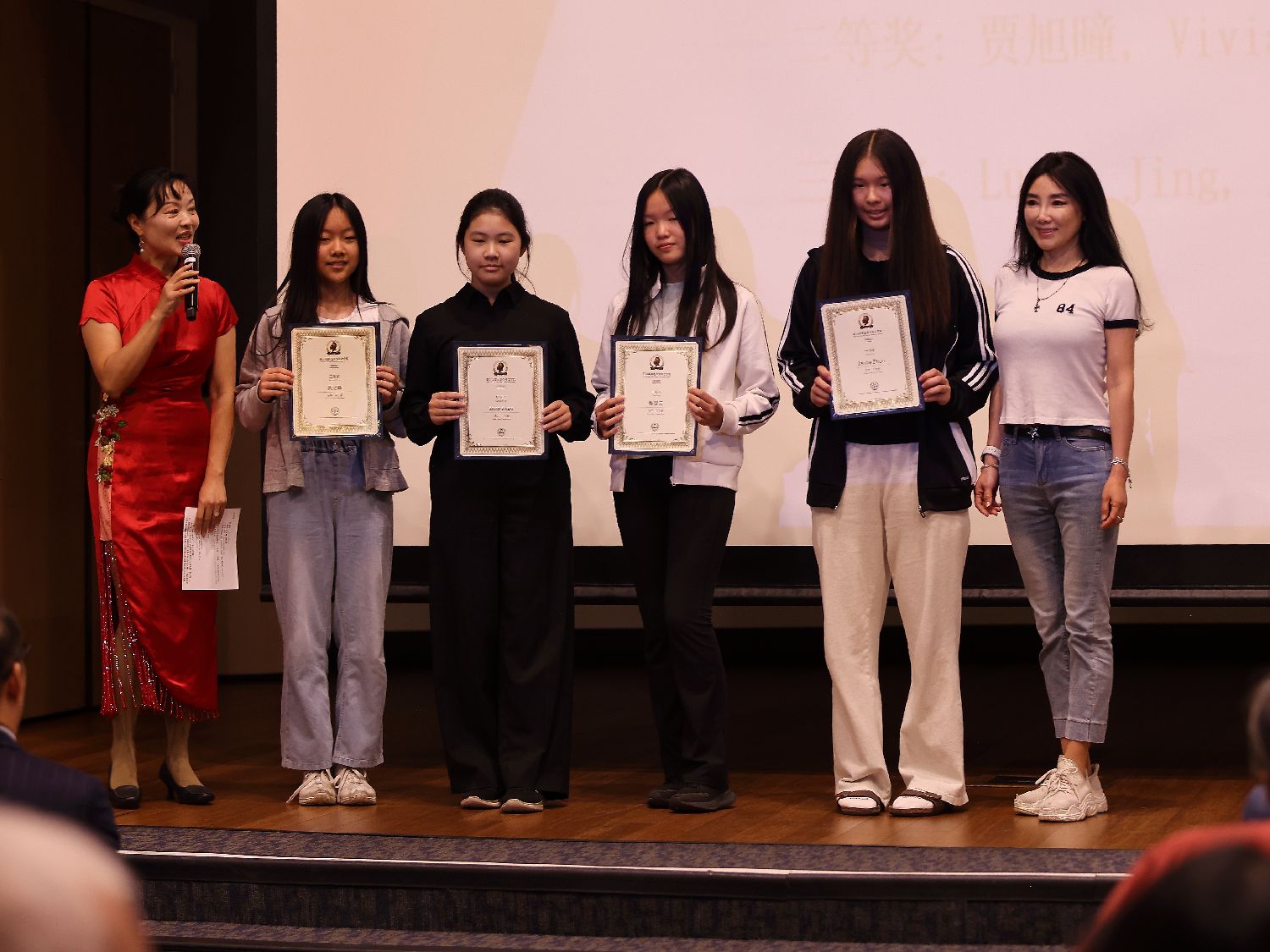 青年中文组获奖者:特等奖:Ted Lu;一等奖:雷华杰、陈渤洋;二等奖:Jacqueline Wong、赖新语、Yuqi Liu;三等奖:PinLing Chen、Serena Ren。颁奖嘉宾:美国《天下华人》集团总裁高云青、刘丹妮。