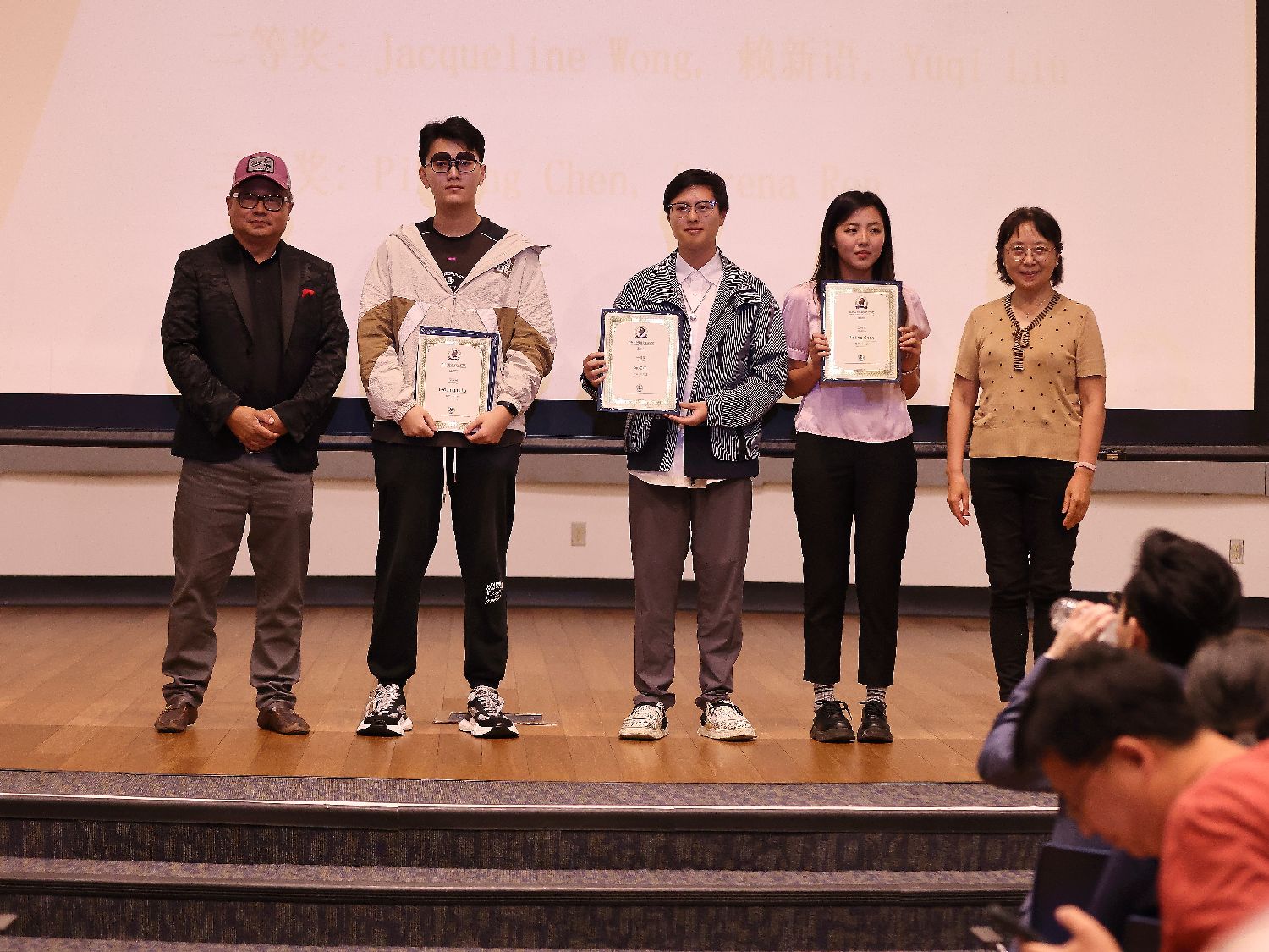 高中中文组获奖者:特等奖:Mingxi Zou;一等奖:Amanda Li、Xu Wang;二等奖:Everett Leigh、Amelia Guan、YuqiaoShao、张乃瑞;三等奖:ANDY WAN、Anning Zhang、陈彤喆、Lucas Liu。颁奖嘉宾:洪扬、Wendy Weng、黄艾。
