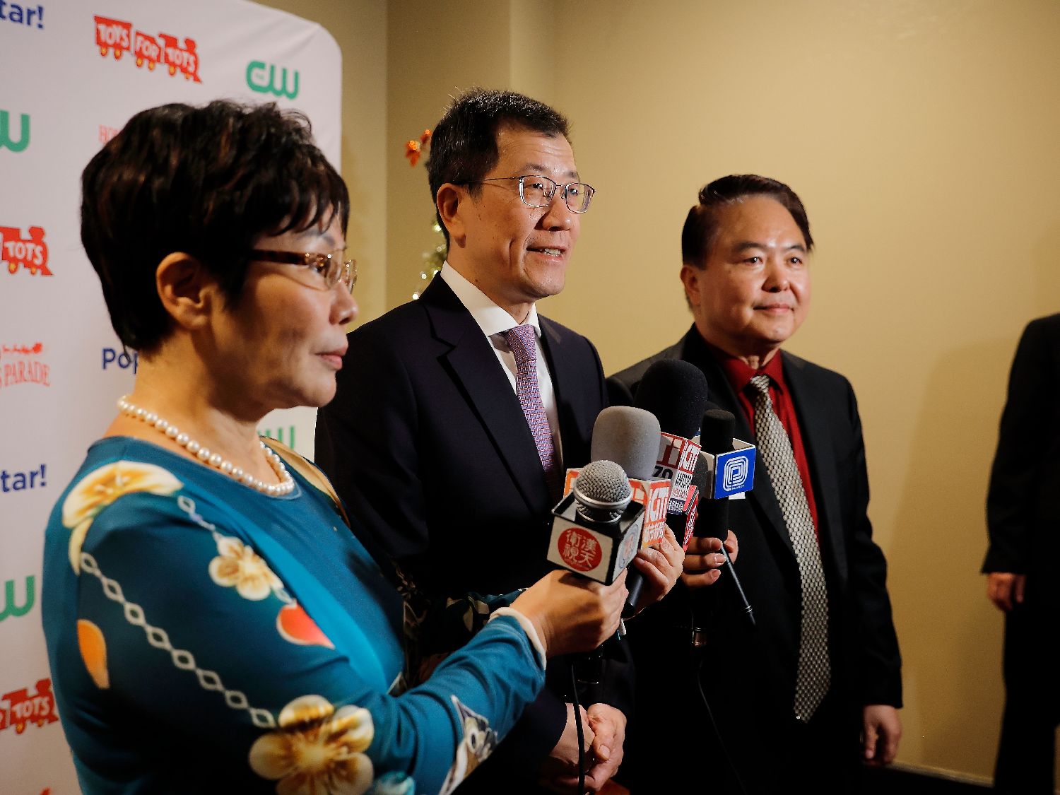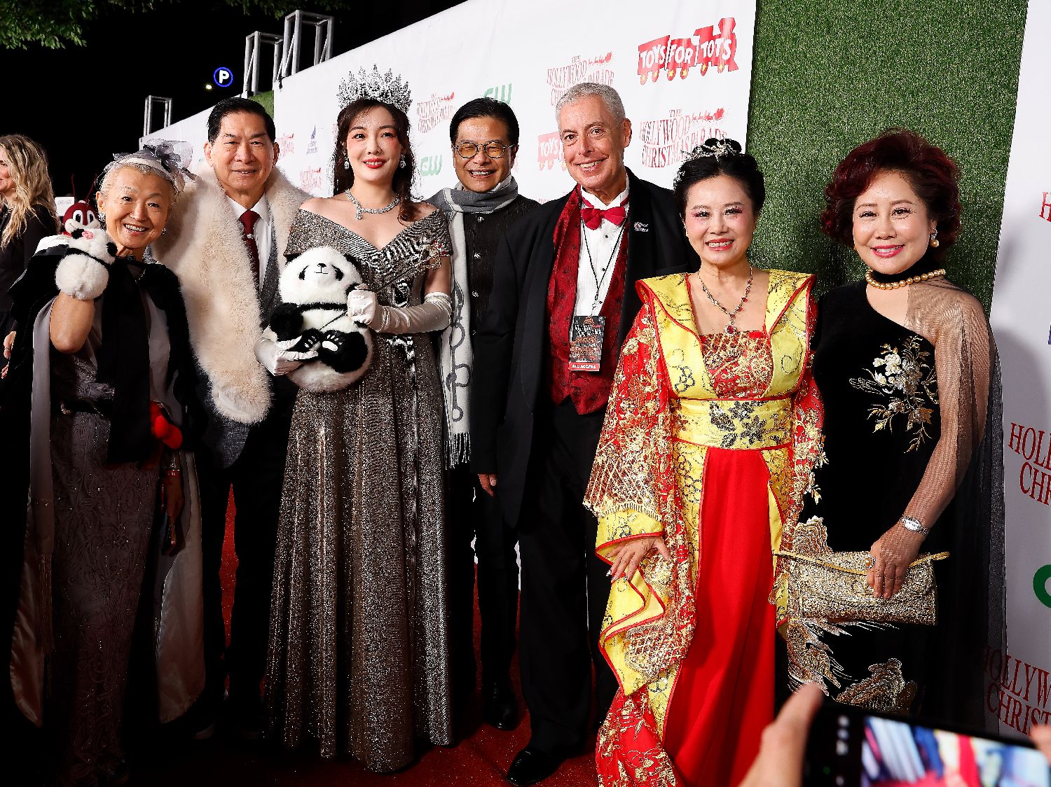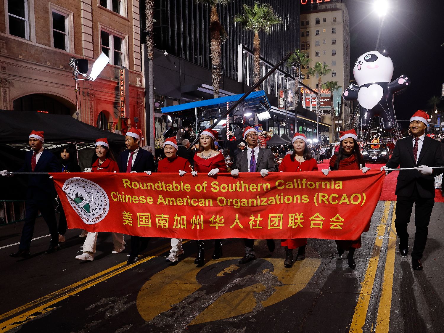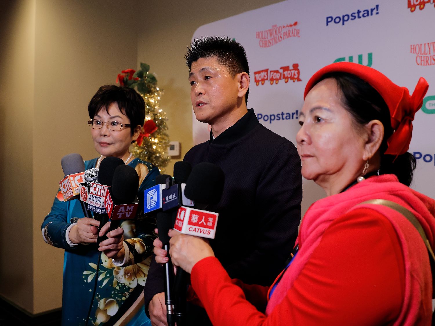美华联好莱坞圣诞大游行组委会主席与总策划陈慧碧、美华联好莱坞圣诞大游行组委会荣誉主席林日昇、美华联好莱坞圣诞大游行组委会执行主席与主持人李嘉璧在游行开始前走红毯时均通过媒体祝愿南加华人华侨圣诞快乐。