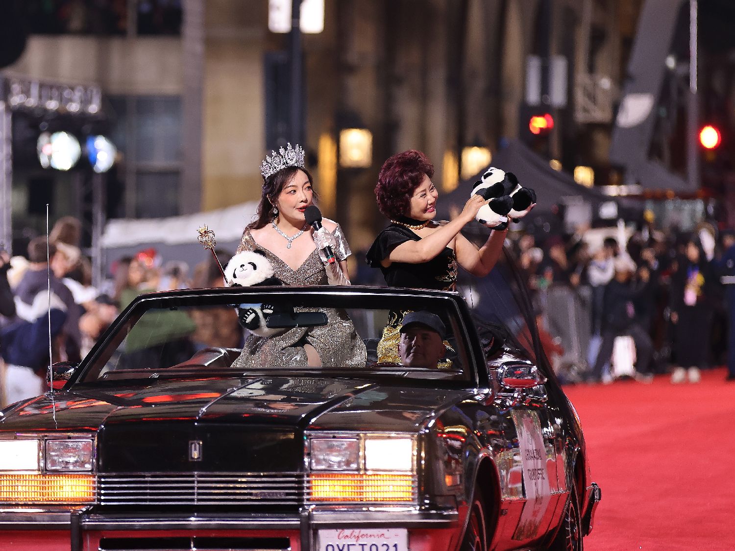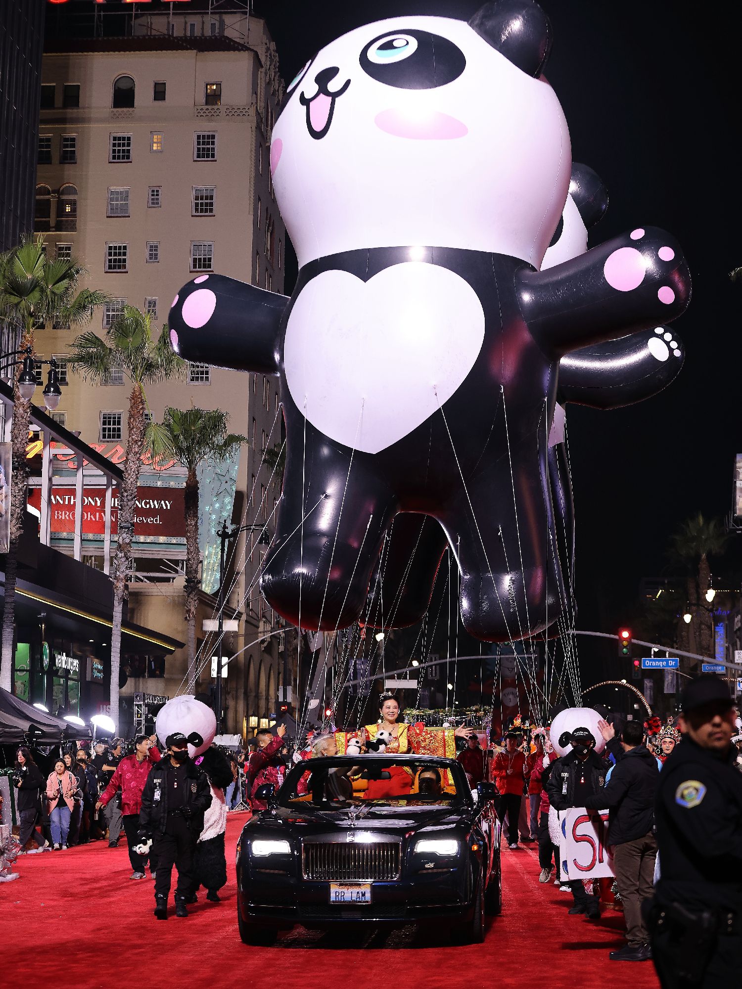 荣誉主席林日昇的礼宾车与大熊猫的表演紧随其后。陈慧碧作为总策划全程在车上协调指挥。车侧由两名表演者装扮成憨态可掬的大熊猫,为现场增添欢快氛围。