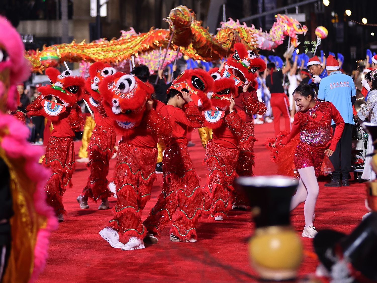 由50名青少年组成的舞狮队方阵,是由美中文化协会与美国奥淇宏盛舞狮团组织的。这支青少年团队活泼灵动,象征吉祥与新生,为游行注入了青春与活力。
