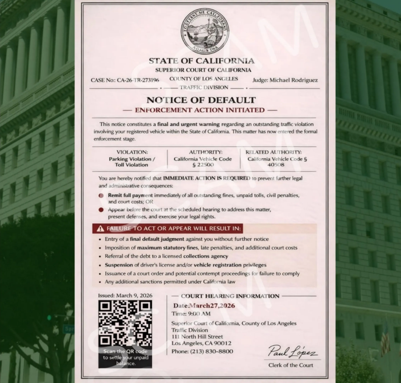据洛杉矶县治安官办公室介绍,这类诈骗通知制作精细,往往包含仿真的官方印章、案件编号等信息,极具迷惑性。诈骗分子通常声称收件人涉及交通违规或收费道路欠费,并以“法律后果”为由施压,要求立即付款。