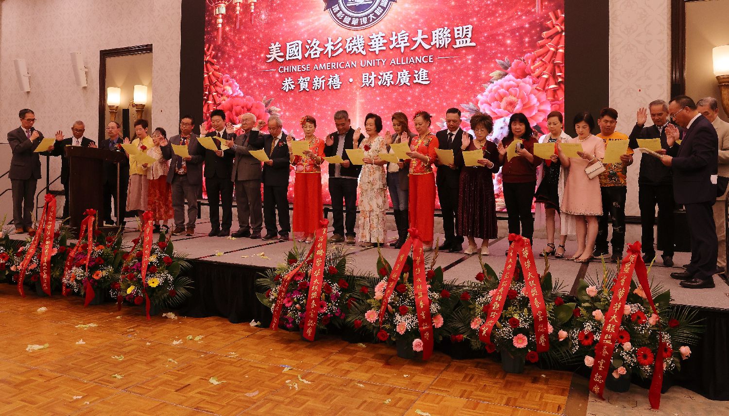 在法官周本立的带领下,新一届联盟理事宣誓就职。新任主席马树荣在中国驻洛杉矶总领馆侨务领事安明栓的监交下接受了印信,完成了就职仪式。当晚的典礼仪式由洛杉矶华埠大联盟执行主席魏林峰与英文秘书马刘爱琼主持。安明栓、赵美心、佩瑞兹、方树强、柔似密市副市长劳朱嘉仪、圣盖博市市议员吴程远、罗省中华会馆主席聂泽英等先后登台致贺。