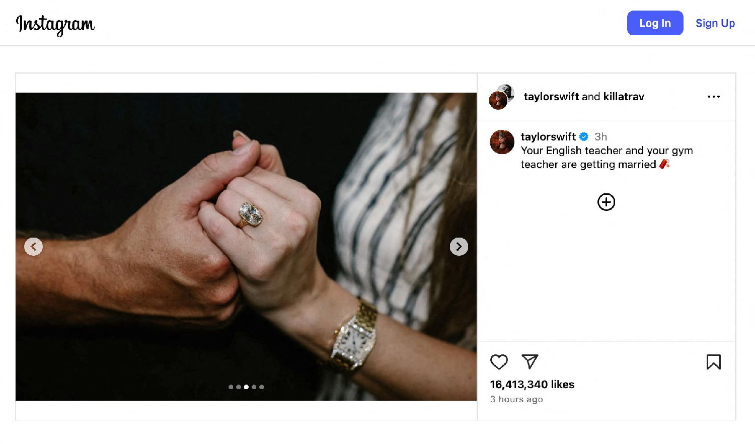 【侨报讯】流行巨星泰勒·斯威夫特(Taylor Swift)与堪萨斯城酋长队明星边锋特拉维斯·凯尔西(Travis Kelce)于8月26日正式宣布订婚,为这段备受瞩目的体娱恋情开启了崭新篇章。此消息一经发布,立即引爆社交媒体,两人在Instagram上联合发布的订婚帖在短短一小时内获得了约1400万个赞。