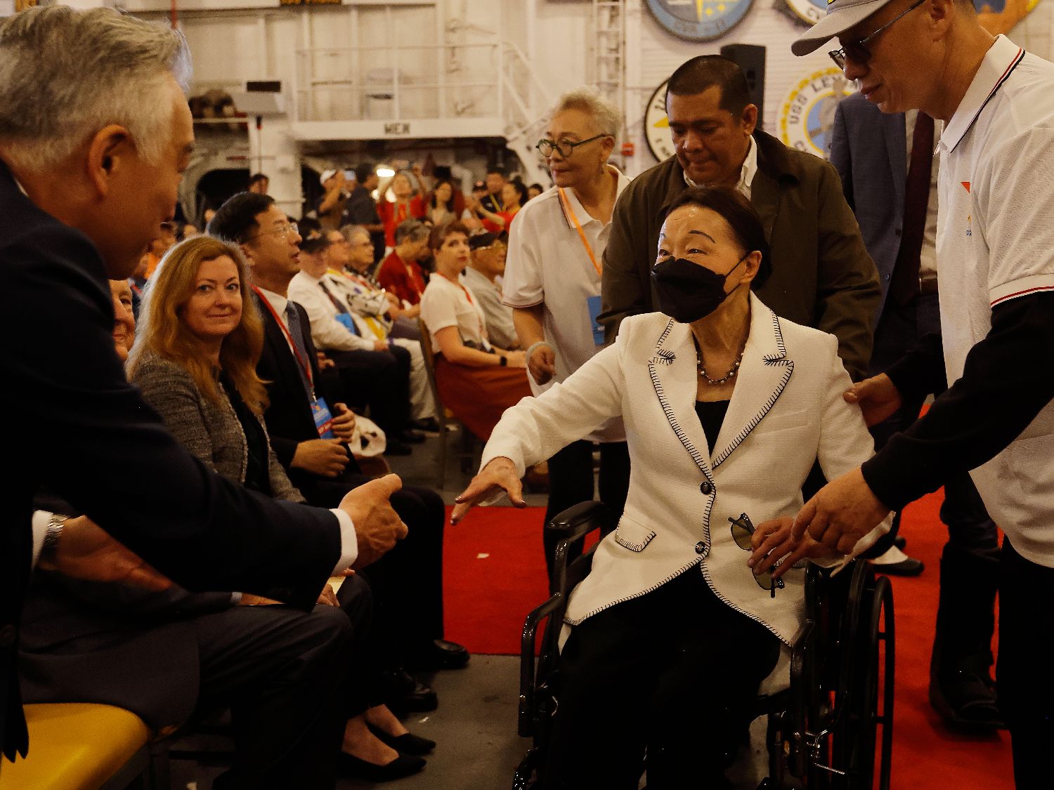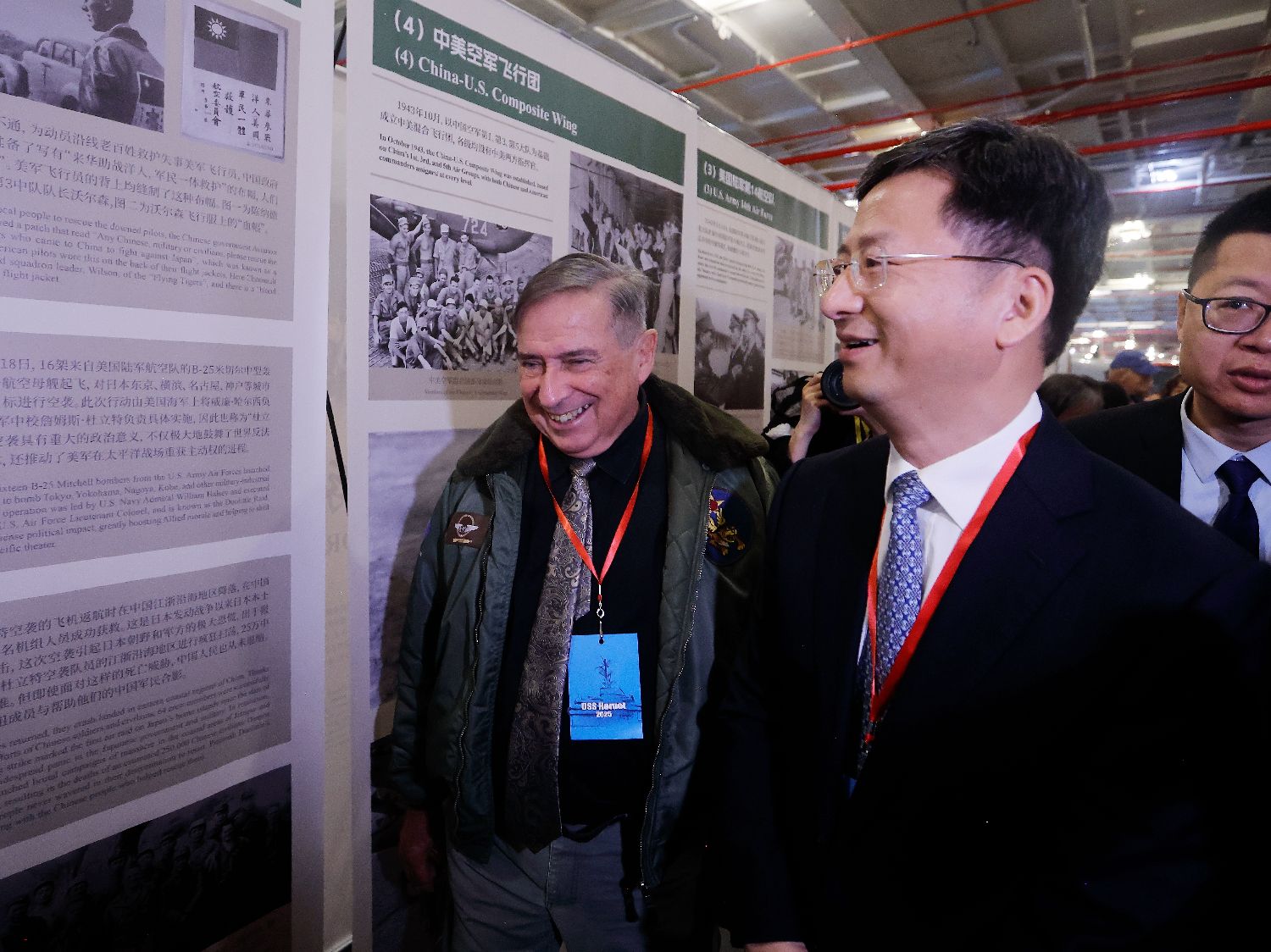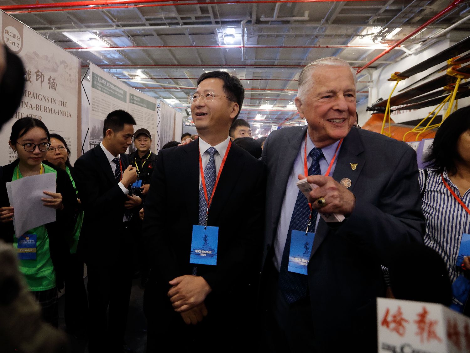【侨报记者陈秋阿拉米达现场报道】8月30日,抗战先烈、志士后人齐聚一堂,百岁飞虎队老兵黎玉荣及60多位中国抗战将领之后、飞虎队老兵及后裔、史迪威将军的孙辈、杜立特行动的后人,登上了停泊在阿拉米达市一港口的大黄蜂号航母,出席当天在舰上联合举办的“中国人民抗日战争暨世界反法西斯战争胜利80周年纪念活动”。