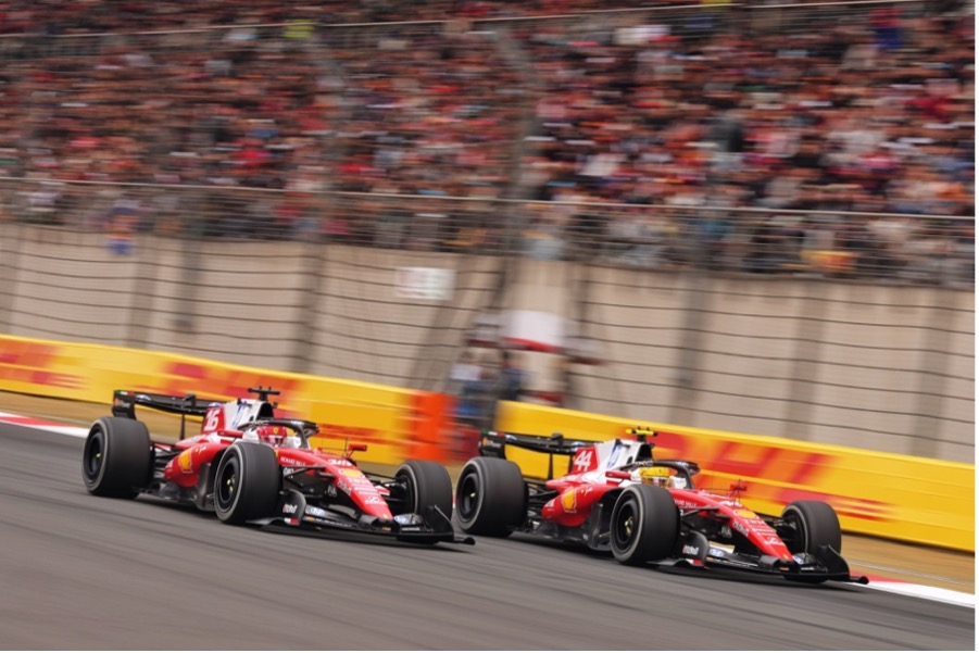3月15日,2026赛季F1中国大奖赛落幕。法拉利车队车手汉密尔顿在正赛中发挥出色,夺得季军,这也是他间隔27站后再次站上领奖台。图为汉密尔顿驾驶赛车(右)从外线超越队友。中新社