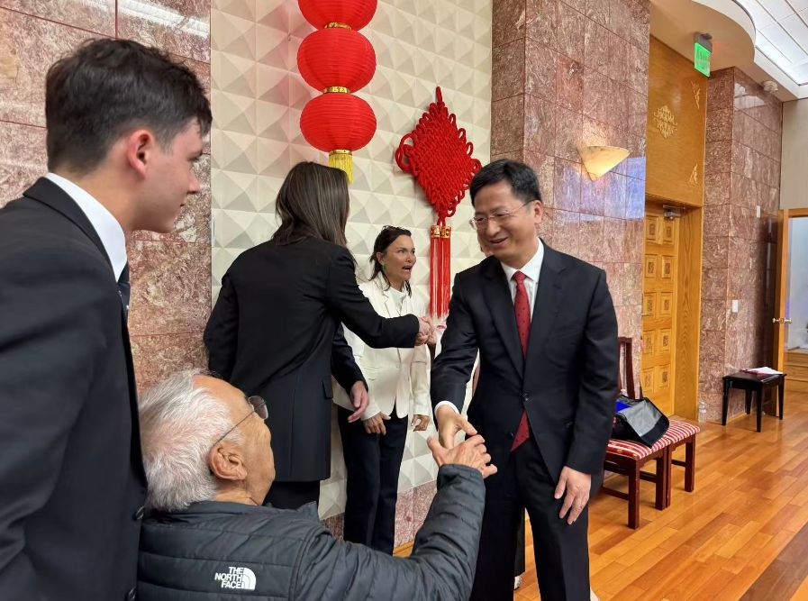 图文:带爷爷参加汉语桥,张建敏总领事与学生家长握手。 侨报记者田霞摄