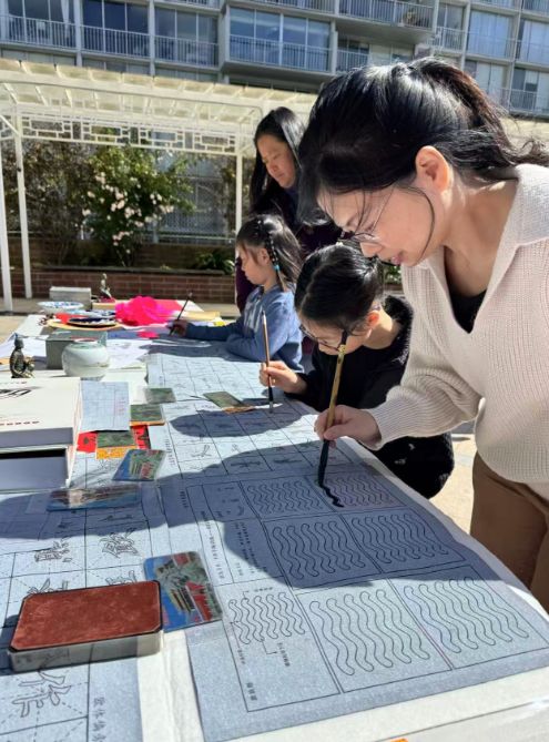 图文:汉语桥活动间歇,朋友们试试毛笔字。 侨报记者田霞摄