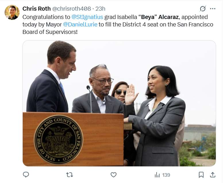 【侨报讯】旧金山市长罗伟(Daniel Lurie)宣布任命29岁的贝雅·阿尔卡拉斯(Beya Alcaraz)为市议会第四区(包括日落区与公园边区)新任议员暂时填补空缺席位。阿尔卡拉斯是日落区土生土长的居民,曾任小企业主及艺术与音乐教师,亦是旧金山市议会历史上首位菲裔女性议员。