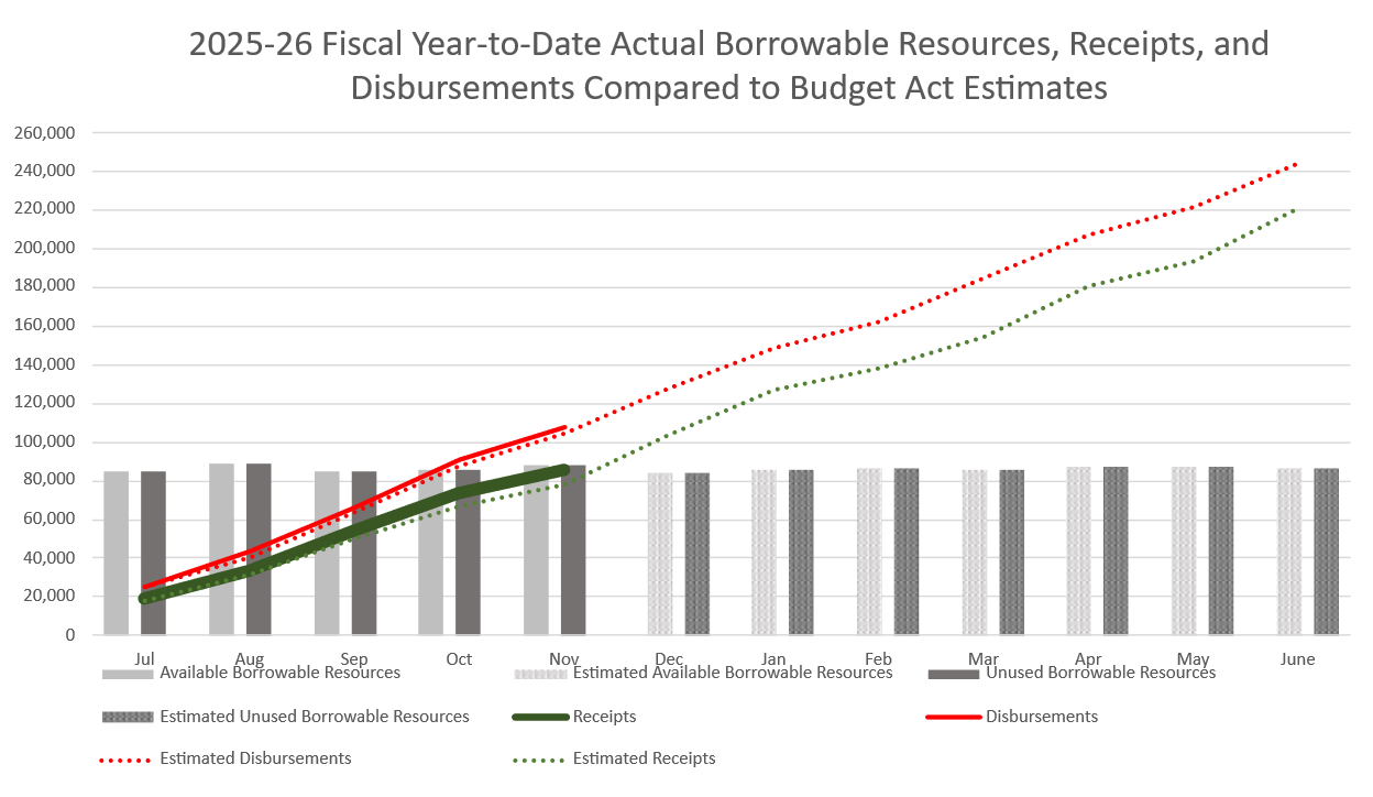 根据主计长办公室公布的《普通基金现金收入与支出月度报告》,截至今年11月,本财政年度普通基金收入较2025—26财年预算案预测高出约70亿美元,增幅达9%;但与此同时,支出也比预期多出31亿美元,增幅为3%。收入“跑赢”预测的同时,支出同样加速,令加州整体财政承压。