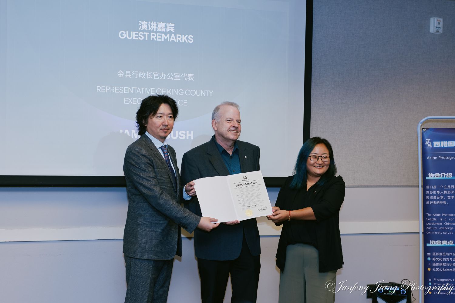 金县行政长官办公室代表詹姆斯·布什(James Bush)特别宣布,将9月14日定为“侨报杯日”,以此表彰展览在促进文化交流和社区建设方面的积极意义。华盛顿州美中贸易促进会会长区伟明(Tony Au)则获颁荣誉顾问称号。格律传媒集团代表王晓达与西雅图华人摄影协会会长赵琰分别致辞,感谢社区支持,并表示将继续推动文化交流事业向前发展。