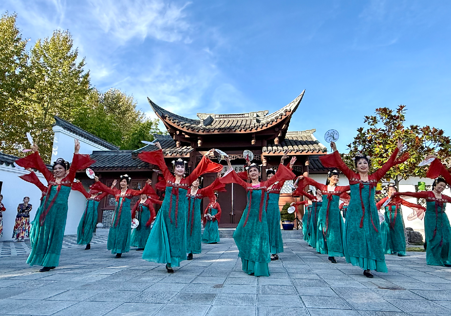 文艺演出环节同样精彩纷呈,吸引众多游客驻足。多年来坚持在西华园义演的古筝演员李欣怡,身着汉服,仪态优雅,以娴熟技艺奏响一曲曲动人乐章,令人沉醉。太极表演者朱利安·梁师傅一袭青衣,静立如松,起势间,如白鹤亮翅,灵动舒展,在动静开合之间,展现出一种和谐的生命韵律,与天地气息交融,演绎着阴阳的平衡与转化。西雅图华音艺术团献上了舞蹈表演,将现场气氛推向高潮,掌声不绝。华音艺术团团长吴小明告诉记者,这是华音艺术团首次受邀在西华园义演,全团格外珍视这次机会。