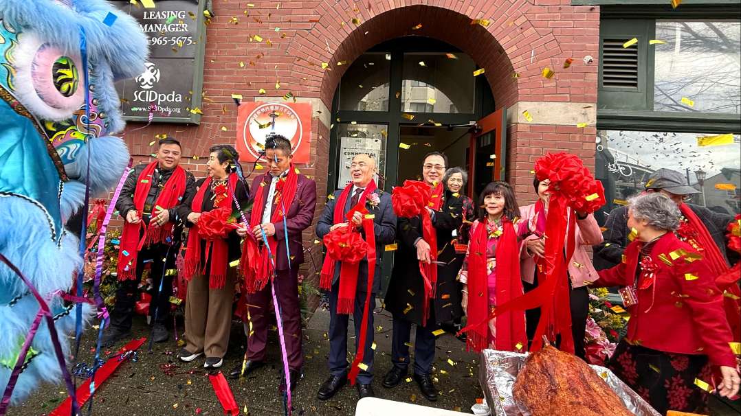当天上午十一时,在西雅图中国城的同乡会会所门前,已率先举行了一场热烈精彩的剪彩仪式。在各界嘉宾的见证和共同参与下,开平同乡会首任会长方东雅率理事会成员侯安娜、谭海峰、阿健等共同为会所揭幕。方东雅会长郑重宣布华盛顿州开平同乡会正式成立!现场锣鼓喧天、鞭炮齐鸣,梅纳德南街(Maynard Ave S)一时成为欢乐的海洋。精彩的龙狮表演吸引了众多游客驻足观看,喝彩声此起彼伏,天空也瞬间清空万里,阳光灿烂,为成立之日增添了祥和气氛。