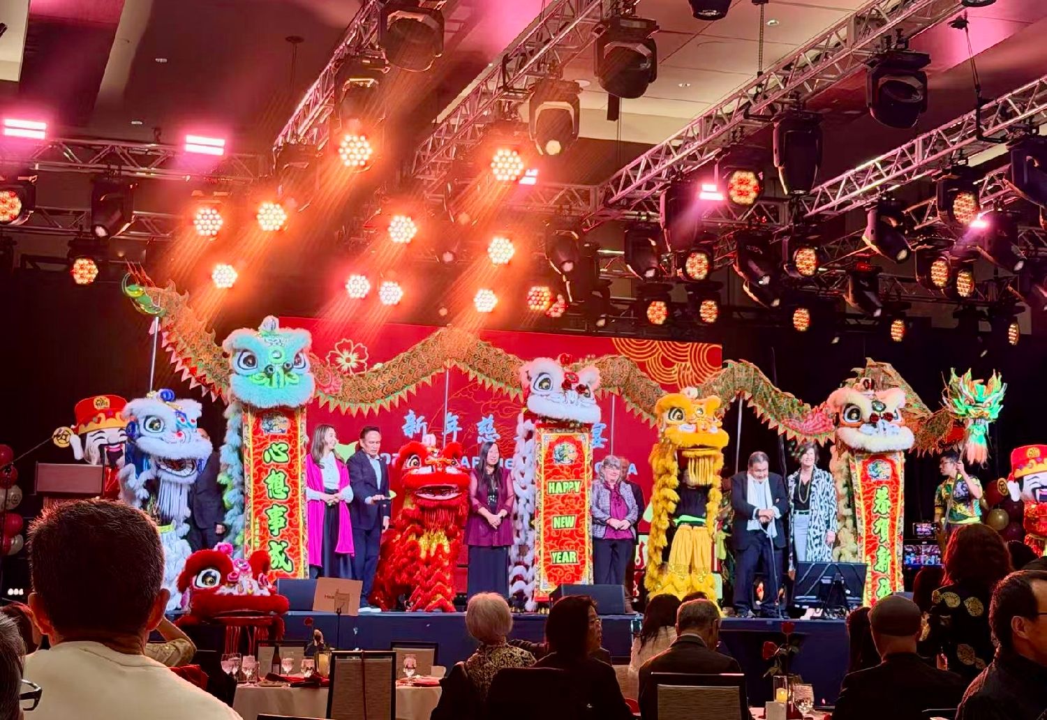 开场环节,华盛顿州大中华香港商会主席李国祥、前Bellevue市长Lynne Robinson、香港贸易发展局洛杉矶办事处处长Chi Tran,以及商会会长Michael Tong共同为醒狮点睛。随后,麦显辉师父率龙狮团队献上气势如虹的表演,鼓点激昂、狮舞生风,正式拉开晚会序幕。
