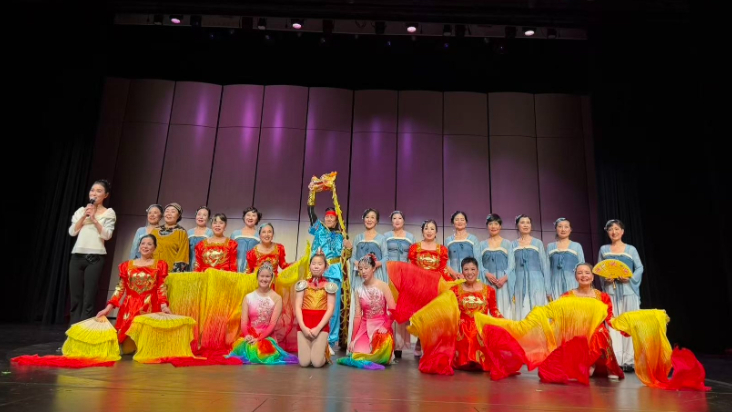 整场演出持续近两个小时,华音艺术团的节目成为观众翘首以待的亮点。演员们带来了三支风格迥异、充满中国韵味的舞蹈作品:《家乡的月亮》《中国话中国美》与《欢庆红绸舞》。舞台上,舞者以细腻的肢体语言与饱满的情感,将东方艺术的柔美与力量诠释得淋漓尽致。《家乡的月亮》旋律悠远,舞姿轻柔,具有故事情节,其中吴小明团长扮演的奶奶让人印象深刻,仿佛将观众轻轻带入那片静谧而深情的故乡夜色;《中国话中国美》节奏明快、灵动自信,尽显中华文化的独特魅力;压轴登场的《欢庆红绸舞》则以热烈奔放的表演将现场气氛推向高潮,红绸飞扬间洋溢着喜庆与活力,赢得掌声雷动、喝彩连连。